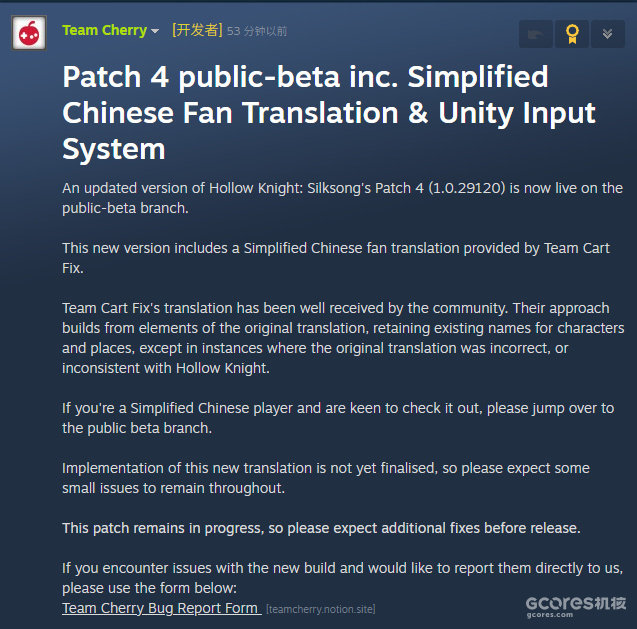 《空洞骑士:丝之歌》新版本(1.0.29120)现已在公开测试分支开放,该版本引入了备受社区欢迎的民间汉化组「修车组(Team Cart Fix )」的中文翻译。